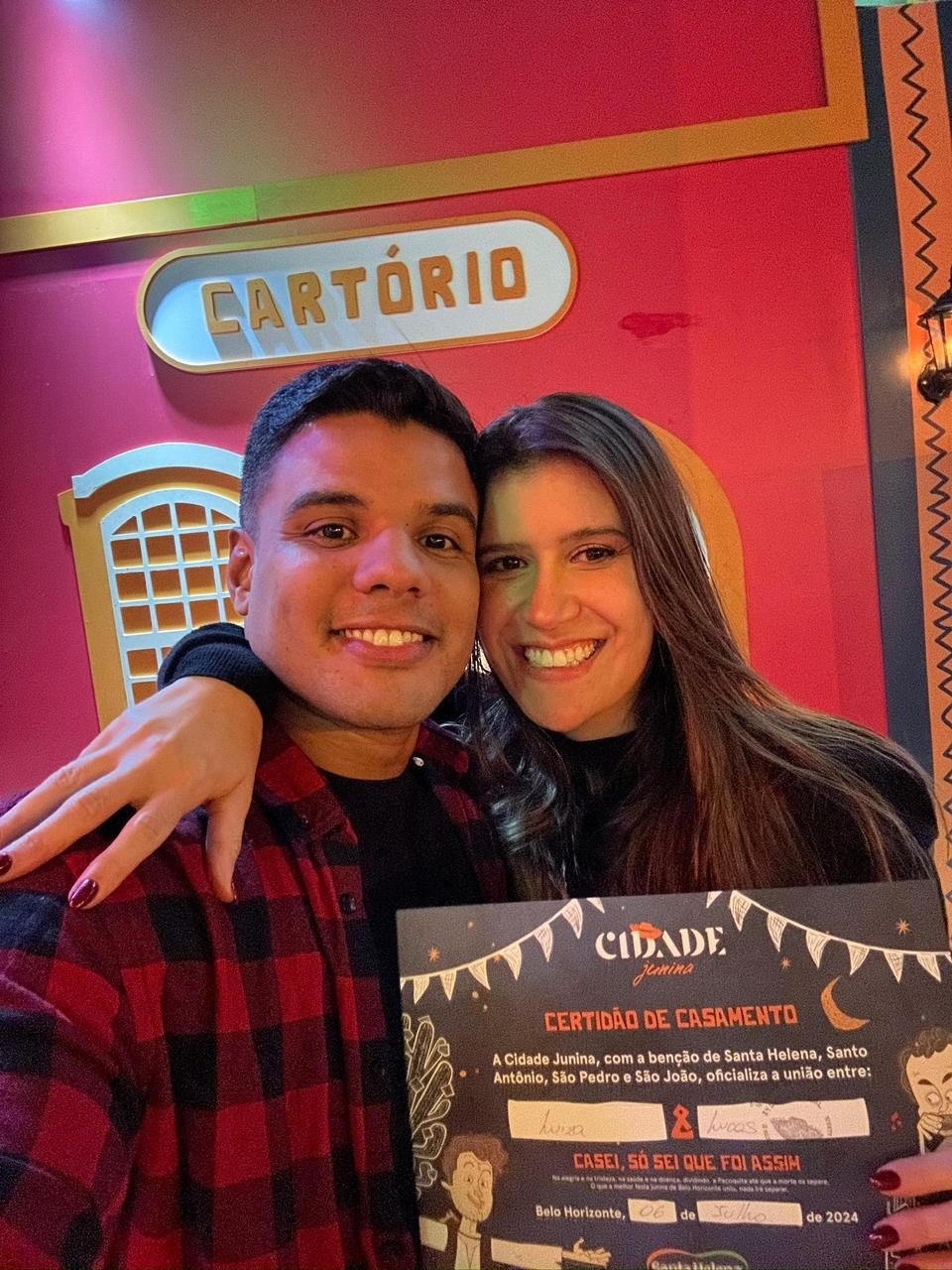 Uma semana depois, na Cidade Junina, veio o pedido de namoro. E, empolgados que somos, saímos de lá “casados” no cartório da festa, com uma certidão que dizia: “O que a melhor festa junina de Belo Horizonte uniu, nada irá separar.”